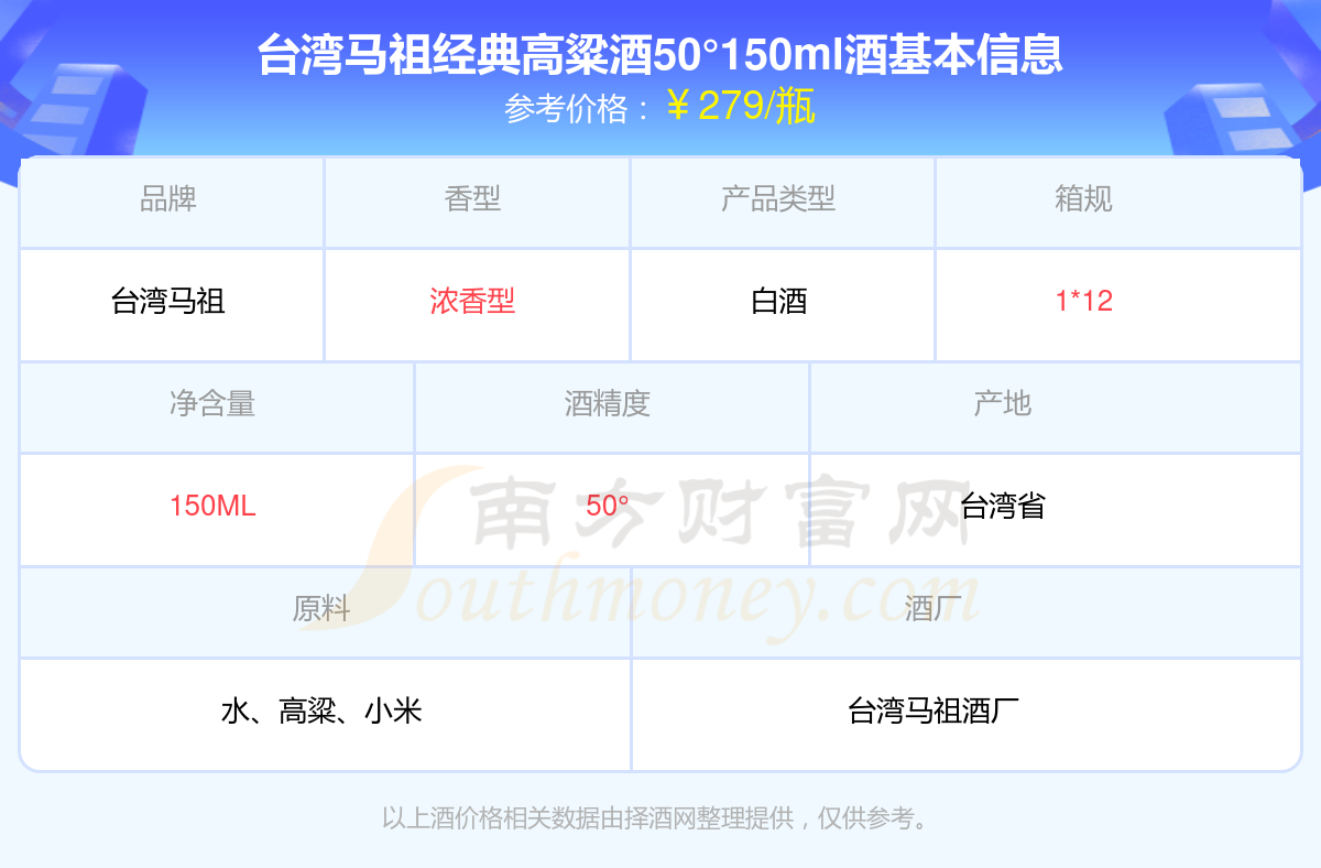 臺灣馬祖經(jīng)典高粱酒50°150ml基本信息