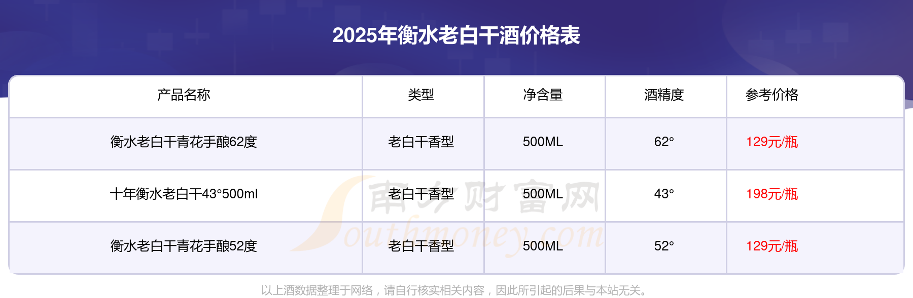 十年衡水老白干43°500ml參考價(jià)198元/瓶、衡水老白干青花手釀52度參考價(jià)129元/瓶、衡水老白干青花手釀62度參考價(jià)129元/瓶。