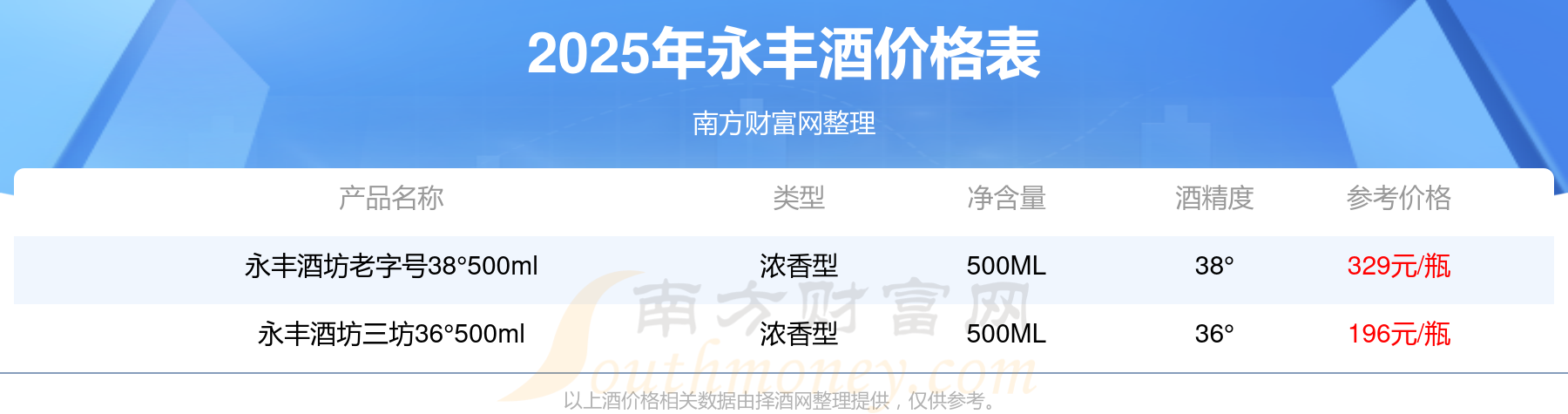 2025年,永豐酒坊老字號38°500ml、永豐酒坊三坊36°500ml等永豐酒價格如下: