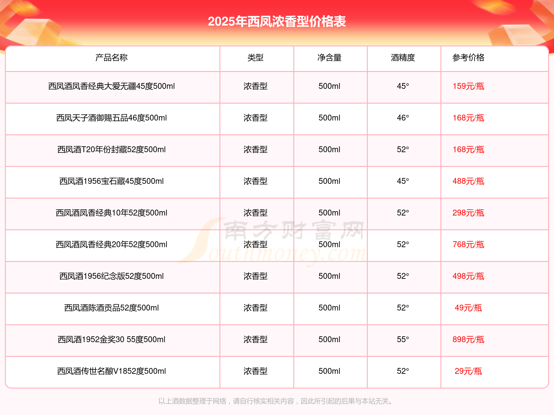 2025年,西鳳濃香型酒價格最高的是西鳳酒 酒海私藏55度3000ml,參考價8880元,最低的是西鳳酒傳世名釀V1852度500ml,參考價29元,價格高低差為8851元。