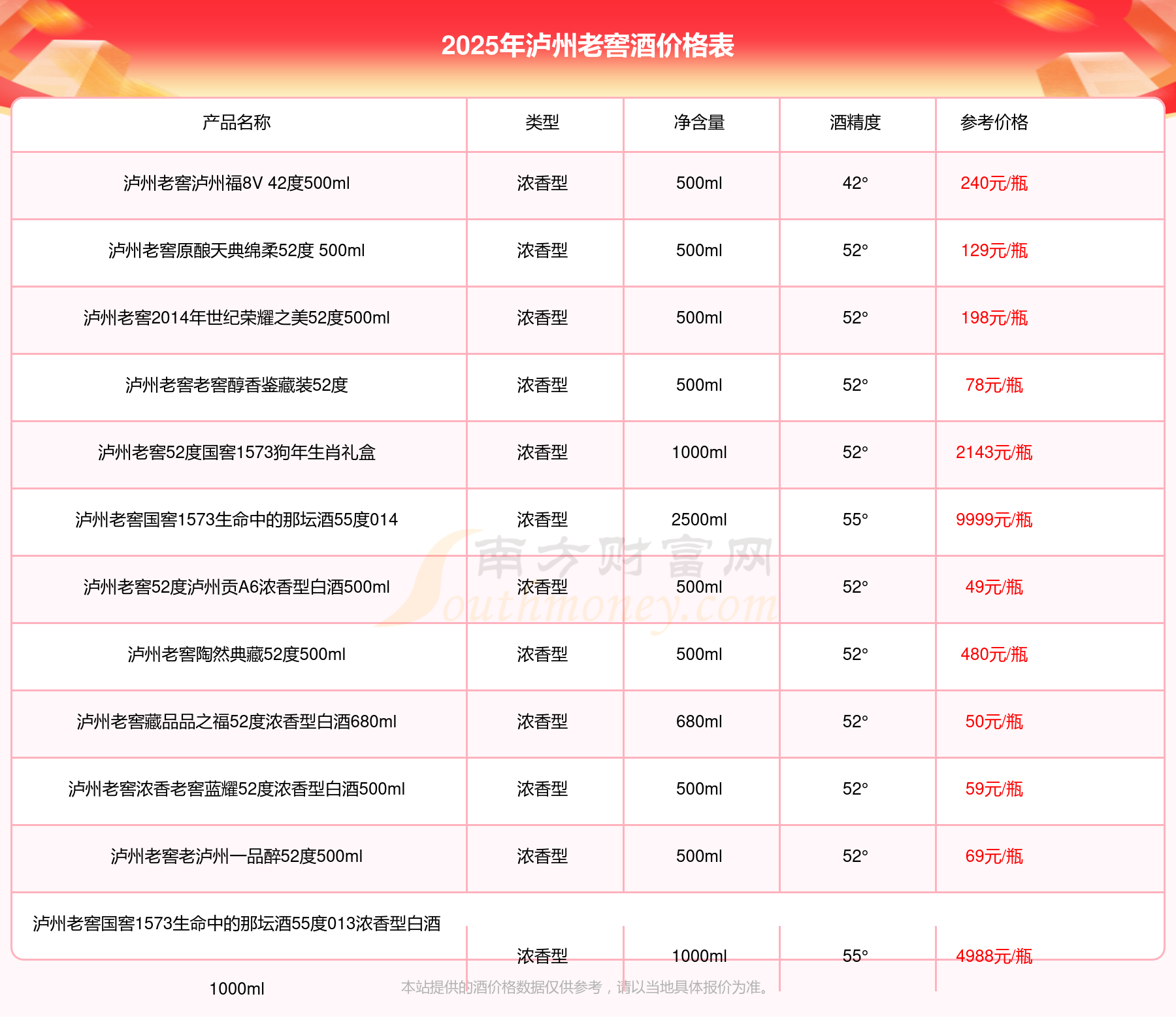瀘州老窖國窖1573春釀鼠兆豐年E 55度參考價17999元/瓶、瀘州老窖國窖1573生命中的那壇酒55度014參考價9999元/瓶、瀘州老窖國窖1573春釀鼠兆豐年A 55度參考價5088元/瓶、瀘州老窖國窖1573生命中的那壇酒55度013濃香型白酒1000ml參考價4988元/瓶、瀘州老窖國窖1573生命中的那壇酒55度009 1000ml參考價4288元/瓶、瀘州老窖國窖1573中國品味52度濃香型白酒500ml參考價2888元/瓶、瀘州老窖國窖1573許燎源概念作品58度濃香型白酒1000ml參考價2680元/瓶。