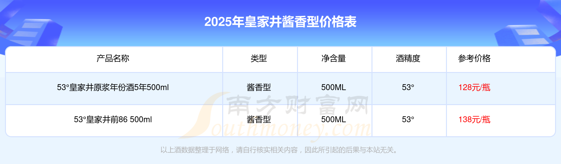 當下皇家井醬香型酒價格最高的酒為53°皇家井前86 500ml,參考價138元/瓶,而皇家井醬香型酒價格最低的是53°皇家井原漿年份酒5年500ml,參考價128元/瓶,價格高低差為10元/瓶。