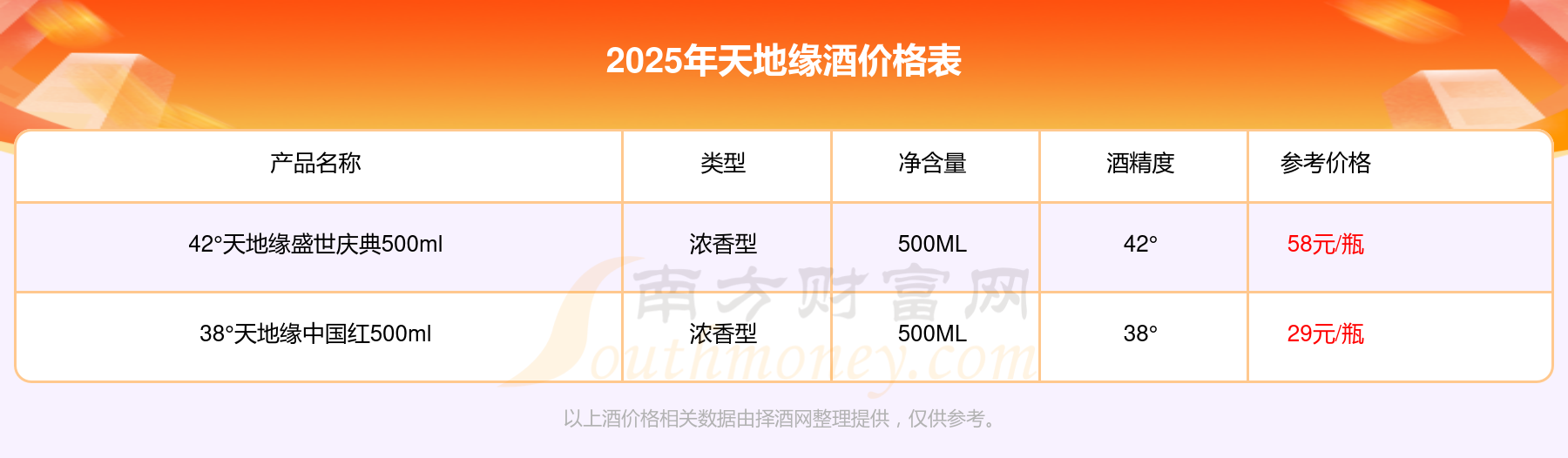 42°天地緣盛世慶典500ml參考價58元/瓶、38°天地緣中國紅500ml參考價29元/瓶。