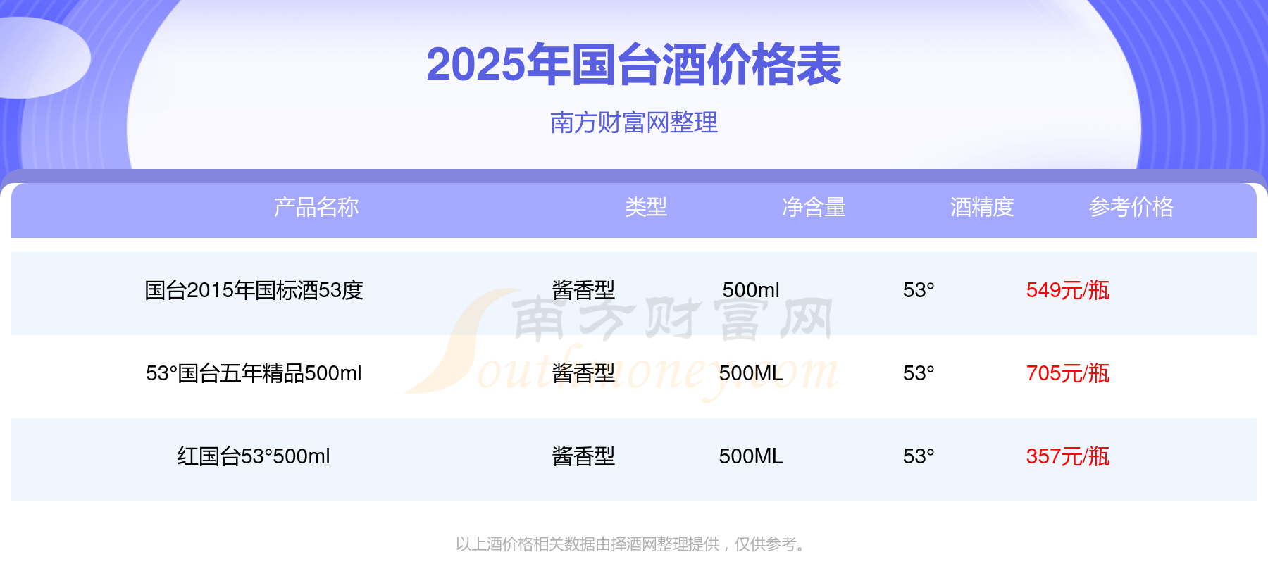 2025年國(guó)臺(tái)酒53°國(guó)臺(tái)五年精品500ml、國(guó)臺(tái)2015年國(guó)標(biāo)酒53度、紅國(guó)臺(tái)53°500ml等最新價(jià)格如下: