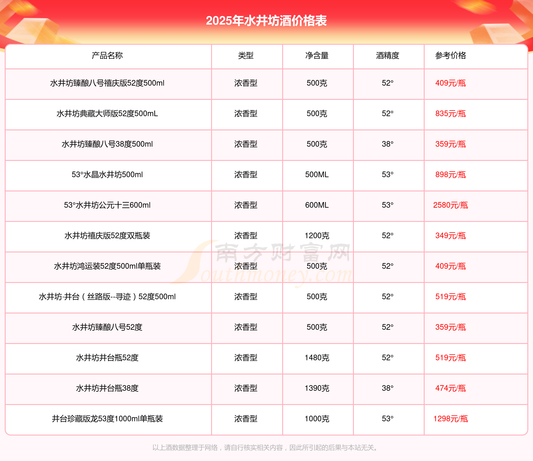 2025年,水井坊酒價格最高的是水井坊大壇收藏級原漿天球瓶66度,參考價13999元,最低的是水井坊小水井52度500ml,參考價158元,價格高低差為13841元。
