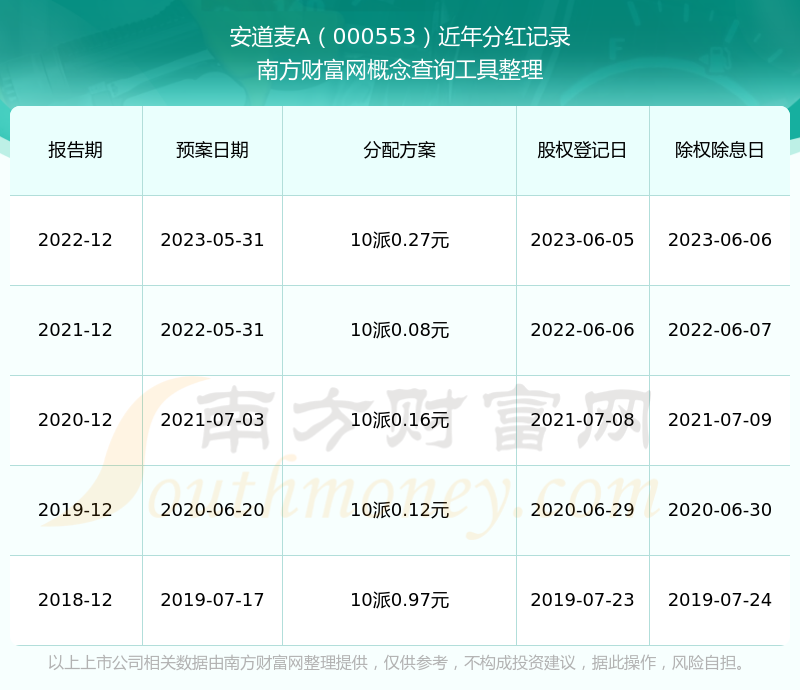 安道麥A最新一次公布的分紅方案為10派0.27元。本次權(quán)益分派股權(quán)登記日為2023年6月5日,除權(quán)除息日為2023年6月6日,派息日為2023年6月6日。
