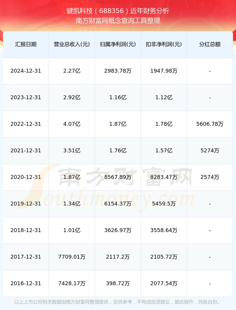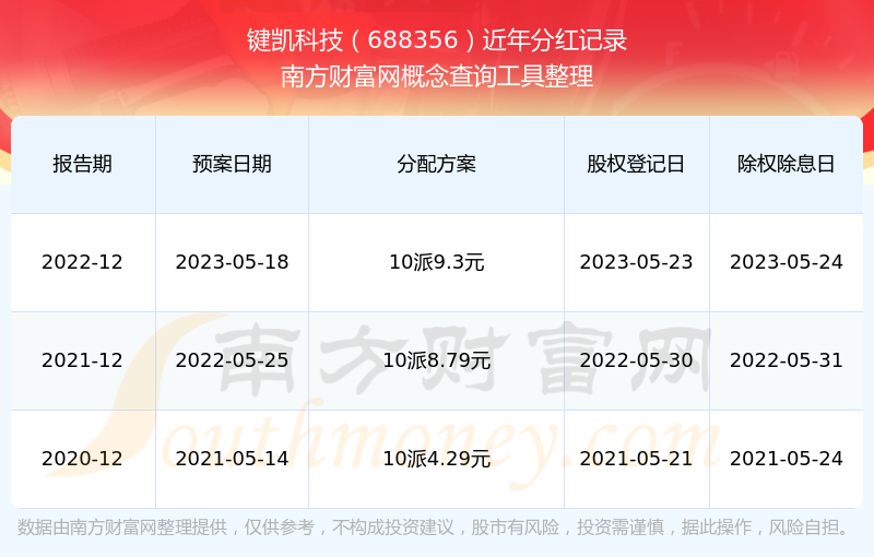 鍵凱科技?xì)v年分紅派息情況如下表所示: