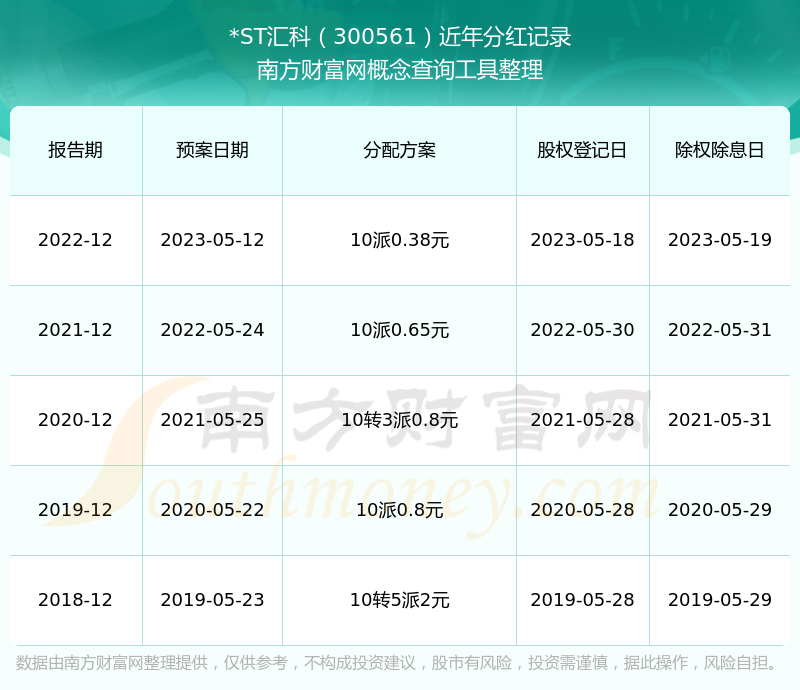 *ST匯科最新一次公布的分紅方案為10派0.38元。本次權(quán)益分派股權(quán)登記日為2023年5月18日,除權(quán)除息日為2023年5月19日,派息日為2023年5月19日。