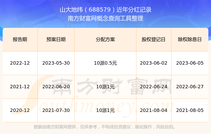 山大地緯最新一次公布的分紅方案為10派0.5元。本次權(quán)益分派股權(quán)登記日為2023年6月2日,除權(quán)除息日為2023年6月5日,派息日為2023年6月5日。
