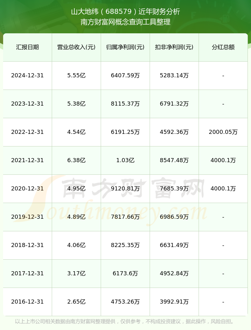 2024年山大地緯總營(yíng)收5.55億,同比增長(zhǎng)3.14%;凈利潤(rùn)6407.59萬(wàn),同比增長(zhǎng)-21.04%;銷售毛利率52.02%。
