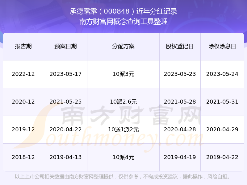 承德露露最新一次公布的分紅方案為10派3元。本次權(quán)益分派股權(quán)登記日為2023年5月23日,除權(quán)除息日為2023年5月24日,派息日為2023年5月24日。