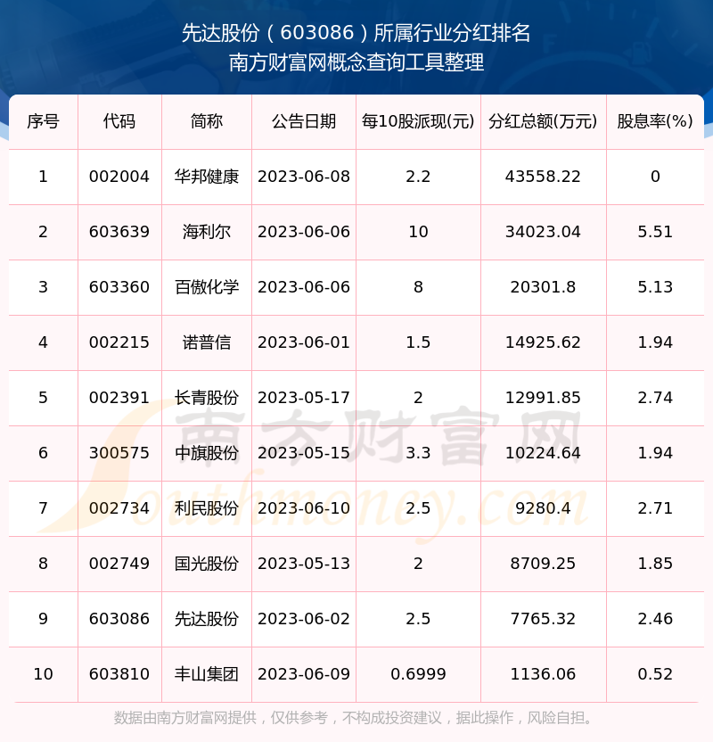 二、先達(dá)股份603086行業(yè)分紅排名
