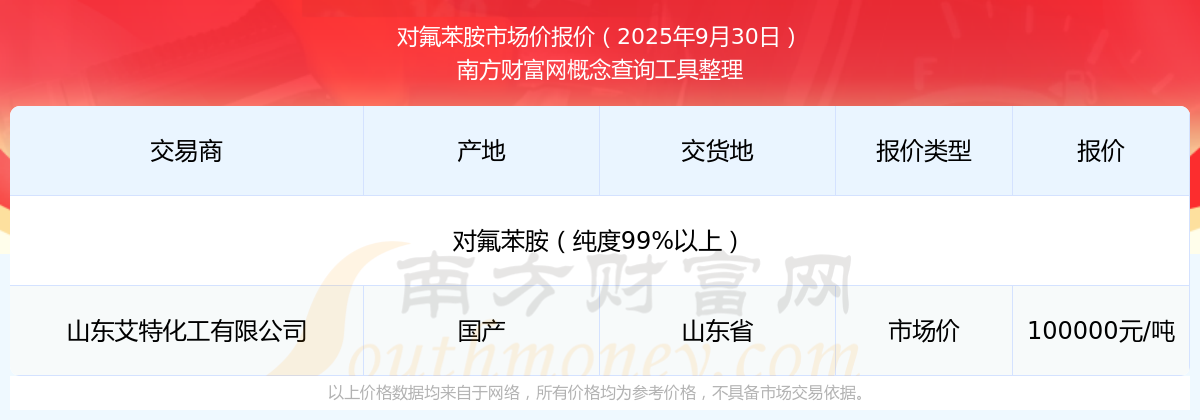 2025年9月30日,對氟苯胺(純度99%以上)市場價價格為100000.00元/噸,報價人:山東艾特化工有限公司,交易地點為山東省。