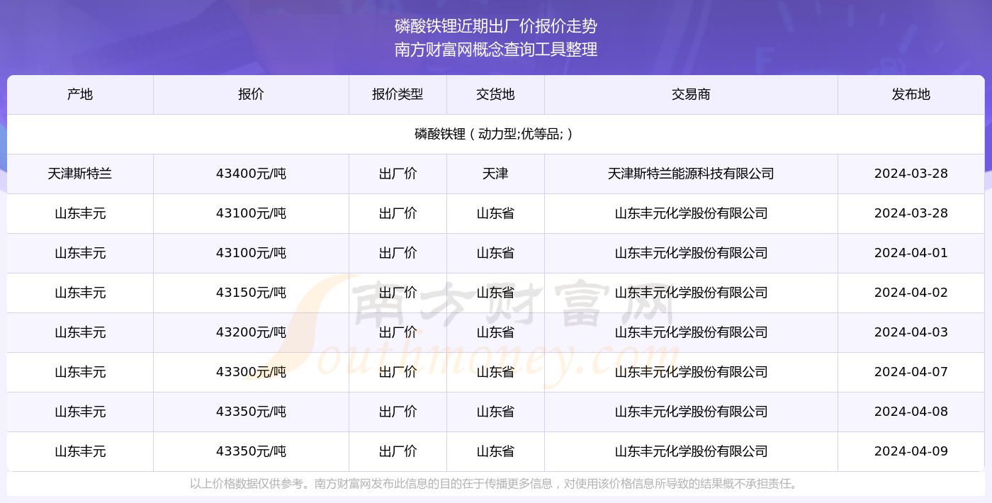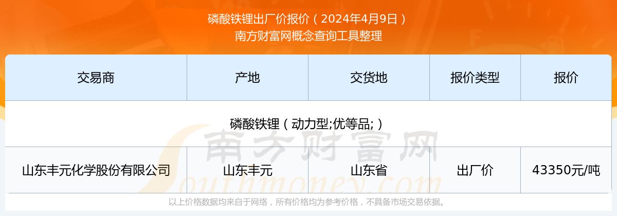 2024年4月9日,山東豐元化學股份有限公司磷酸鐵鋰(動力型;優(yōu)等品;),山東豐元,交易地點為山東省,出廠價報價為43350.00元/噸。