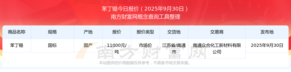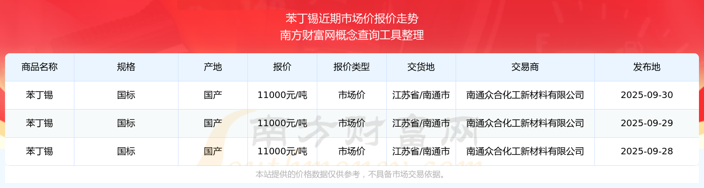 2025年9月30日,南通眾合化工新材料有限公司苯丁錫(國(guó)標(biāo)),國(guó)產(chǎn),交易地點(diǎn)為江蘇省/南通市,市場(chǎng)價(jià)報(bào)價(jià)為11000.00元/噸。