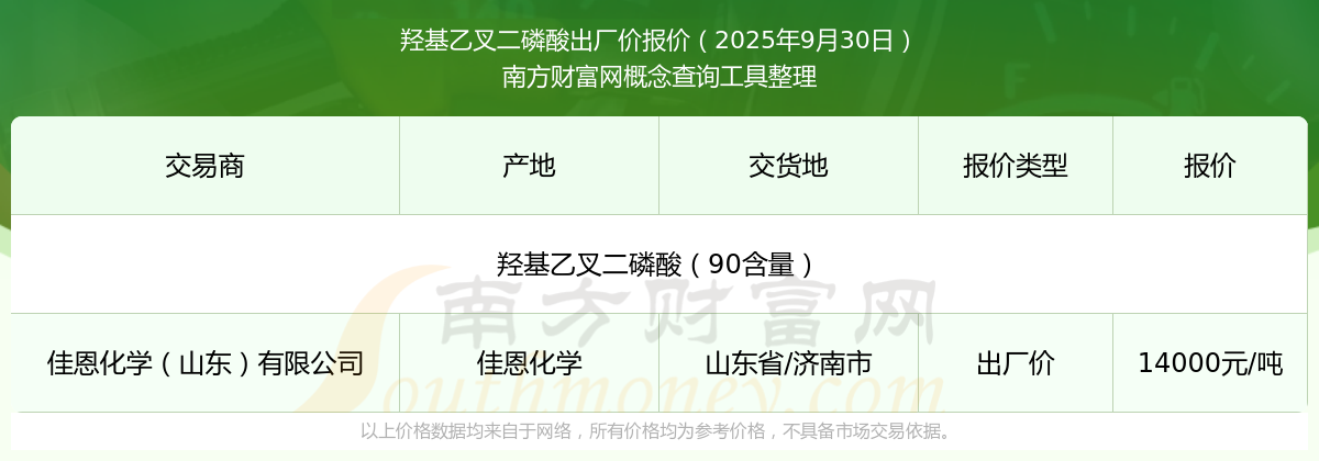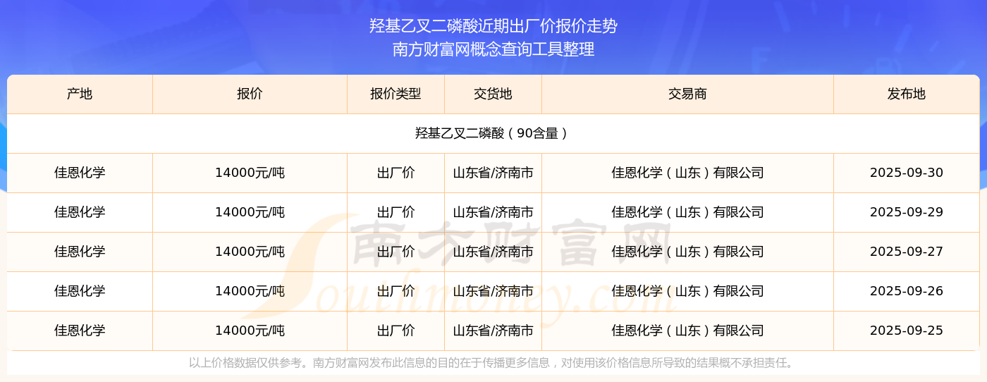 2025年9月30日,羥基乙叉二磷酸(90含量)出廠價價格為14000.00元/噸,報價人:佳恩化學(xué)(山東)有限公司,交易地點為山東省/濟南市。