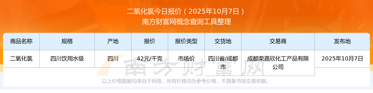 2025年10月7日,二氧化氯(四川飲用水級(jí))價(jià)格為42.00元/千克,報(bào)價(jià)人:成都榮嘉欣化工產(chǎn)品有限公司,交易地點(diǎn)為四川省/成都市。