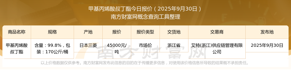 2025年9月30日甲基丙烯酸叔丁酯市場(chǎng)價(jià)報(bào)價(jià)查詢及近期市場(chǎng)價(jià)報(bào)價(jià)走勢(shì)