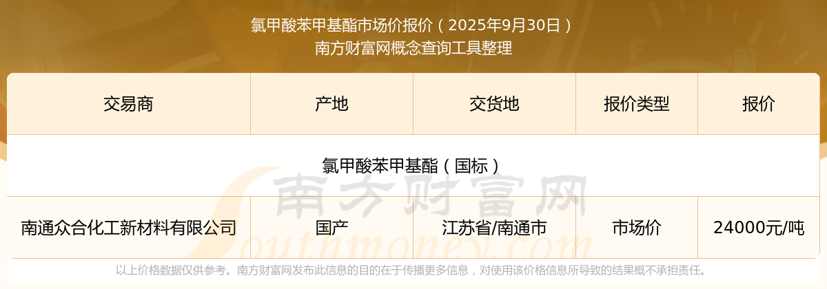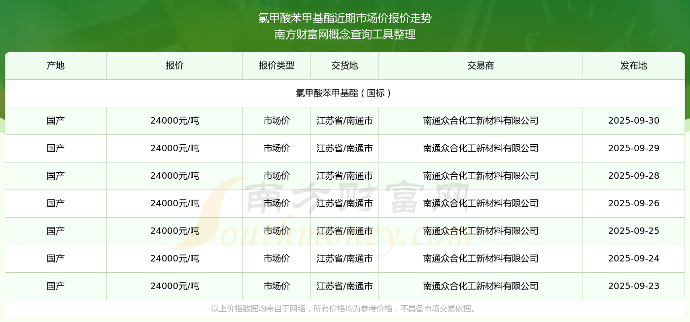 2025年9月30日,南通眾合化工新材料有限公司氯甲酸苯甲基酯(國(guó)標(biāo)),國(guó)產(chǎn),交易地點(diǎn)為江蘇省/南通市,市場(chǎng)價(jià)報(bào)價(jià)為24000.00元/噸。