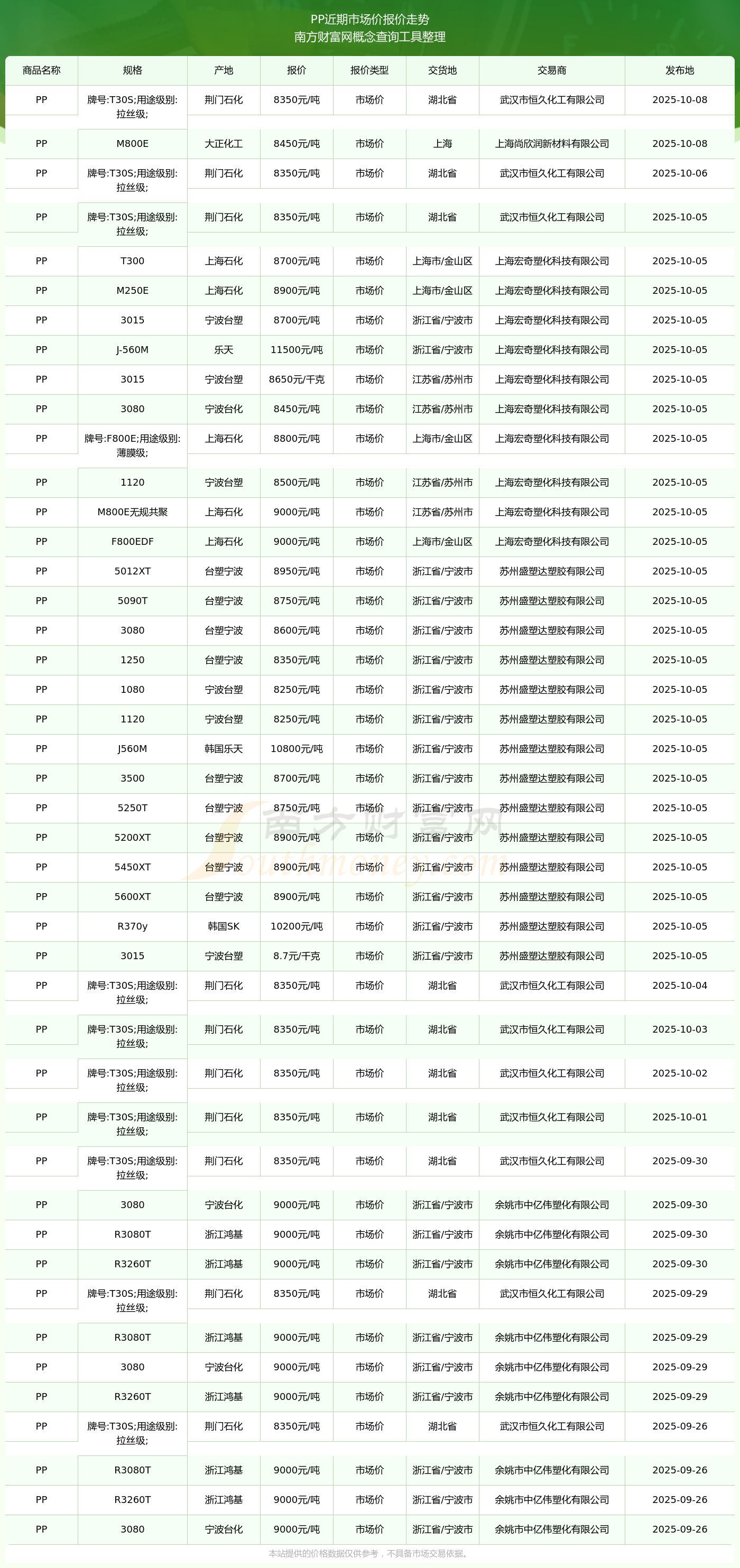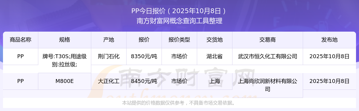 2025年10月8日,PP(牌號:T30S;用途級別:拉絲級;)市場價價格為8350.00元/噸,報價人:武漢市恒久化工有限公司,交易地點為湖北省。