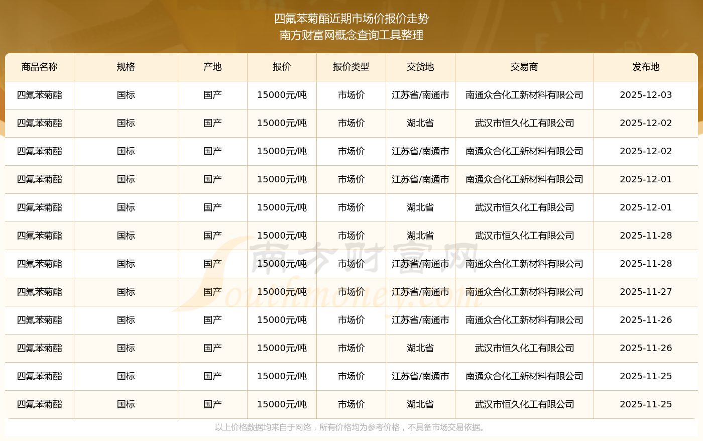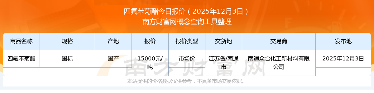 2025年12月3日,四氟苯菊酯(國標(biāo))市場價(jià)價(jià)格為15000.00元/噸,報(bào)價(jià)人:南通眾合化工新材料有限公司,交易地點(diǎn)為江蘇省/南通市。