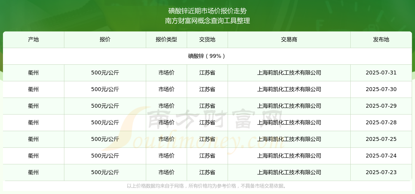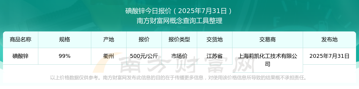 2025年7月31日,上海莉凱化工技術(shù)有限公司碘酸鋅(99%),衢州,交易地點(diǎn)為江蘇省,市場(chǎng)價(jià)報(bào)價(jià)為500.00元/公斤。