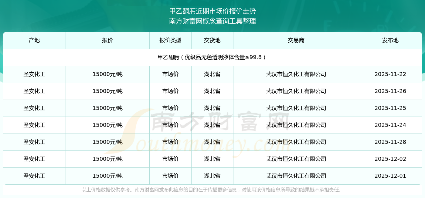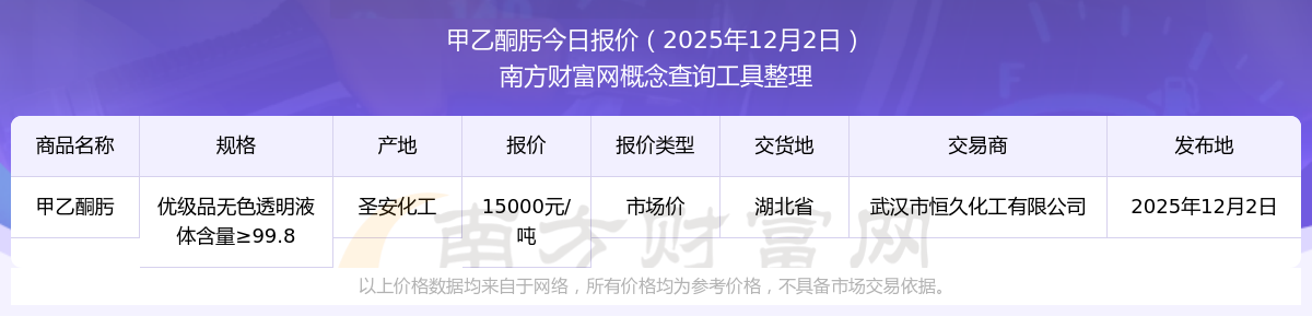 2025年12月2日,甲乙酮肟(優(yōu)級品無色透明液體含量≥99.8)市場價價格為15000.00元/噸,報價人:武漢市恒久化工有限公司,交易地點為湖北省。
