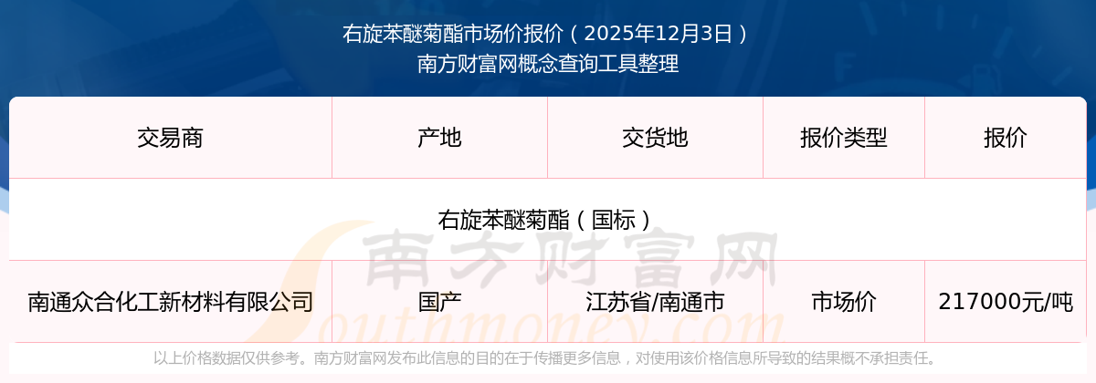 2025年12月3日,右旋苯醚菊酯(國標(biāo))市場價價格為217000.00元/噸,報價人:南通眾合化工新材料有限公司,交易地點為江蘇省/南通市。