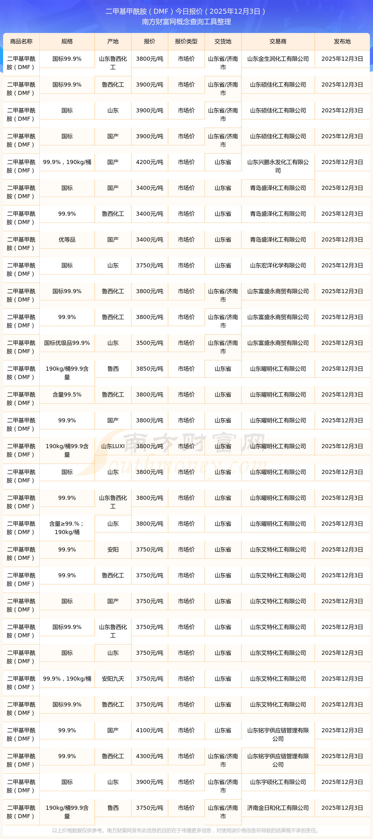 2025年12月3日,二甲基甲酰胺(DMF)(國(guó)標(biāo)99.9%)價(jià)格為3800.00元/噸,報(bào)價(jià)人:山東金生潤(rùn)化工有限公司,交易地點(diǎn)為山東省/濟(jì)南市。