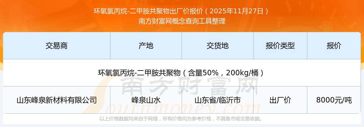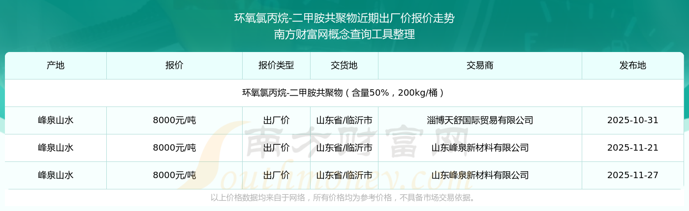 2025年11月27日,山東峰泉新材料有限公司環(huán)氧氯丙烷-二甲胺共聚物(含量50%,200kg/桶),峰泉山水,交易地點(diǎn)為山東省/臨沂市,出廠價(jià)報(bào)價(jià)為8000.00元/噸。