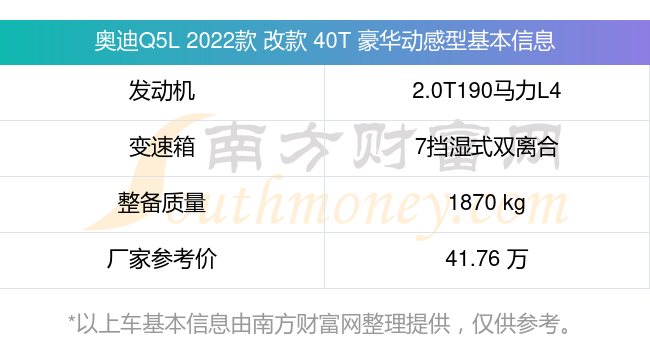 在動力上,奧迪Q5L 2022款 改款 40T 豪華動感型配備的是一臺2.0T190馬力L4渦輪增壓發(fā)動機(jī),匹配的是7擋濕式雙離合自動檔變速箱,燃料形式為汽油,常規(guī)整備質(zhì)量1870kg,廠家參考價(jià)41.76萬元。