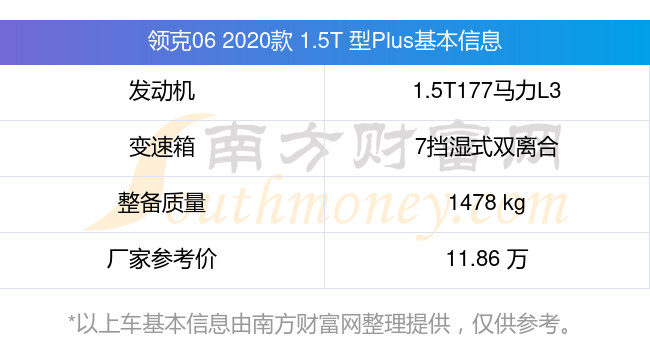 領(lǐng)克06 2020款 1.5T 型Plus動力上搭載的是一臺1.5T177馬力L3渦輪增壓發(fā)動機(jī),匹配7擋濕式雙離合自動檔變速箱,燃料形式為汽油,常規(guī)整備質(zhì)量1478kg,廠家參考價(jià)11.86萬元。