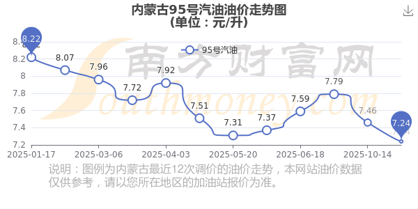 11月6日,內(nèi)蒙古95號(hào)汽油的價(jià)格是7.24元每升,本次的調(diào)整時(shí)間為10月28日,對(duì)比上次的調(diào)整跌了0.22元,跌2.949%,11月10日24時(shí)為下一輪油價(jià)調(diào)整時(shí)間,還有4.49天。
