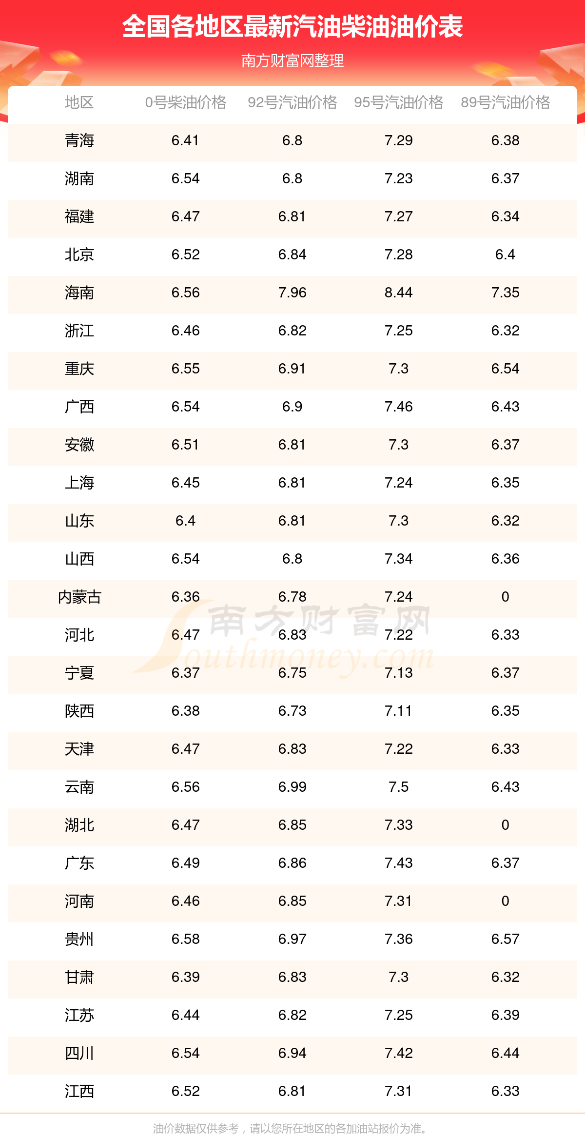 2025年11月6日全國(guó)各地汽油價(jià)格一覽表