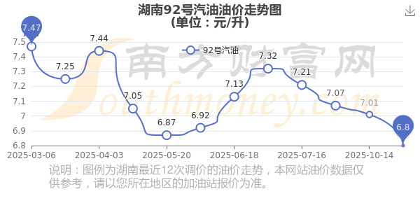 11月6日,湖南92號汽油的價格是6.8元每升,本次的調(diào)整時間為10月28日,對比上次的調(diào)整跌了0.21元,跌3.006%,下次調(diào)整時間為11月10日24時,還有4.46天。