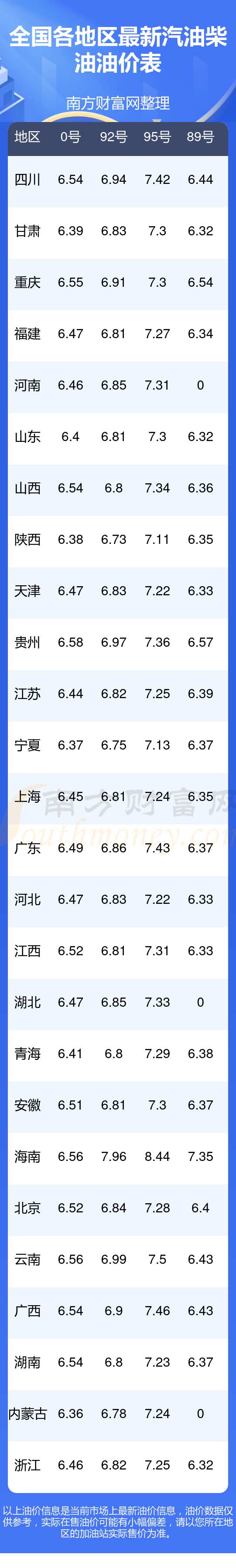 2025年11月6日全國各地油價調整及最新汽油價格表