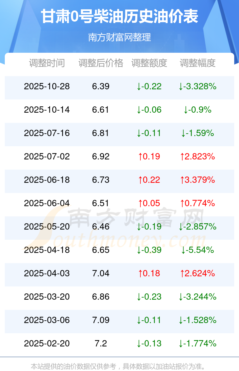 11月6日,甘肅0號(hào)柴油的價(jià)格是6.39元每升,本次的調(diào)整時(shí)間為10月28日,對(duì)比上次的調(diào)整下降了0.22元,下降3.328%,11月10日24時(shí)為下一輪油價(jià)調(diào)整時(shí)間,還有4.43天。