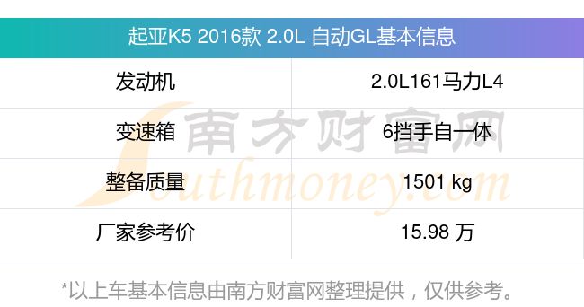 在動(dòng)力方面,起亞K5 2016款 2.0L 自動(dòng)GL搭載的是一臺2.0L161馬力L4自然吸氣發(fā)動(dòng)機(jī),匹配6擋手自一體自動(dòng)檔變速箱,燃料形式為汽油,常規(guī)整備質(zhì)量1501kg,廠家參考價(jià)15.98萬元。