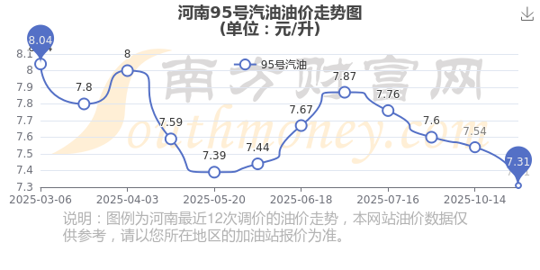 11月6日,河南汽油、柴油每升最新價格為:調(diào)整時間為10月28日,92號汽油為6.85元,減了0.21元,減幅達2.98%;95號汽油為7.31元,減了0.23元,減幅達3.05%;0號柴油為6.46元,減了0.22元,減幅達3.29%。