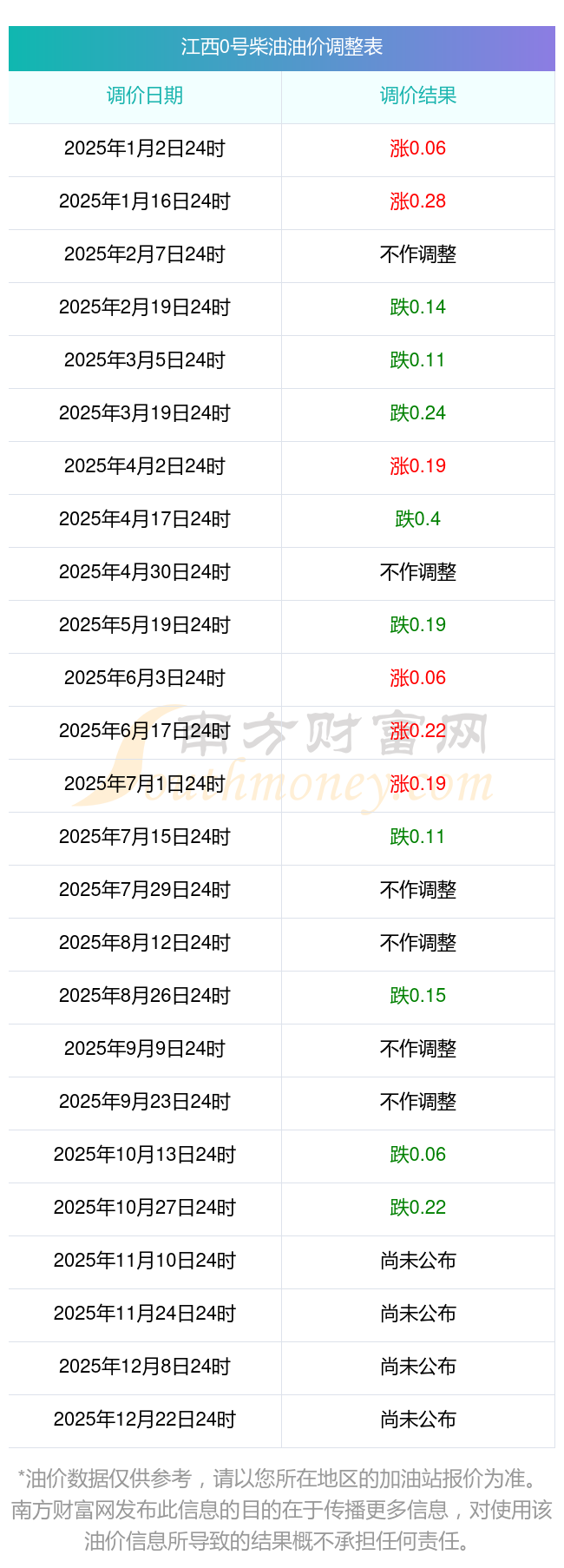 11月6日,江西0號(hào)柴油的價(jià)格是6.52元每升,本次的調(diào)整時(shí)間為10月28日,對(duì)比上次的調(diào)整減了0.22元,減3.264%,11月10日24時(shí)為下一輪油價(jià)調(diào)整時(shí)間,還有4.41天。