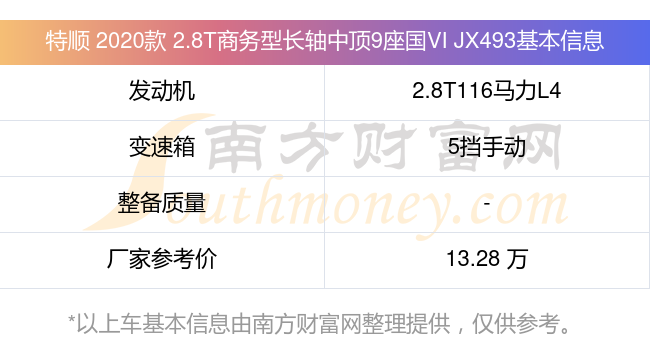 特順 2020款 2.8T商務(wù)型長軸中頂9座國VI JX493動(dòng)力方面,搭載的是一臺(tái)2.8T116馬力L4渦輪增壓發(fā)動(dòng)機(jī),匹配5擋手動(dòng)擋變速箱,燃料形式為柴油,廠家參考價(jià)13.28萬元。