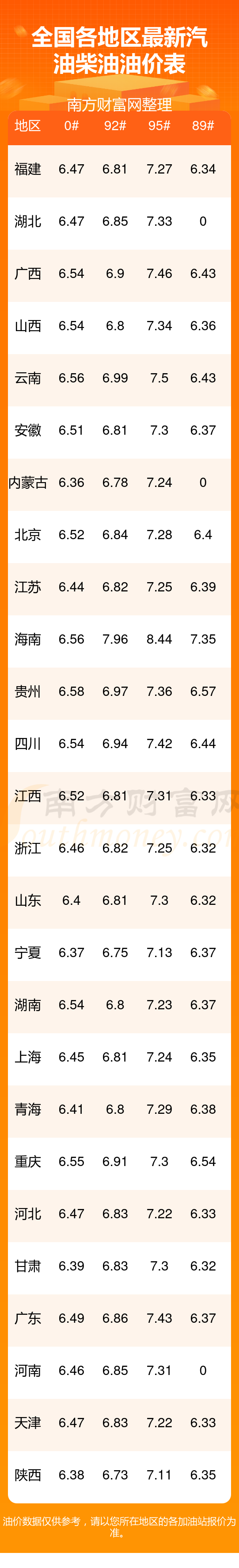 本輪油價的調(diào)整時間為10月28日,調(diào)整后全國92號汽油平均價格為7元每升,其中,最低為陜西的6.73元/升,最高為海南的7.96元/升。全國95號汽油平均價格為7元每升,其中,最低為陜西的7.11元/升,最高為海南的8.44元/升。全國0號柴油平均價格為:6元每升,其中,最低為內(nèi)蒙古的6.36元/升,最高為貴州的6.58元/升。全國89號汽油平均價格為6元每升,其中,最低為浙江的6.32元/升,最高為海南的7.35元/升。下一輪油價調(diào)整時間11月10日24時,距離現(xiàn)在還有4.4天。