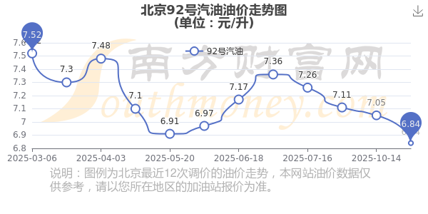 11月6日,北京92號(hào)汽油的價(jià)格是6.84元每升,本次的調(diào)整時(shí)間為10月28日,對(duì)比上次的調(diào)整下調(diào)了0.21元,下調(diào)2.979%,11月10日24時(shí)為下一輪油價(jià)調(diào)整時(shí)間,還有4.39天。