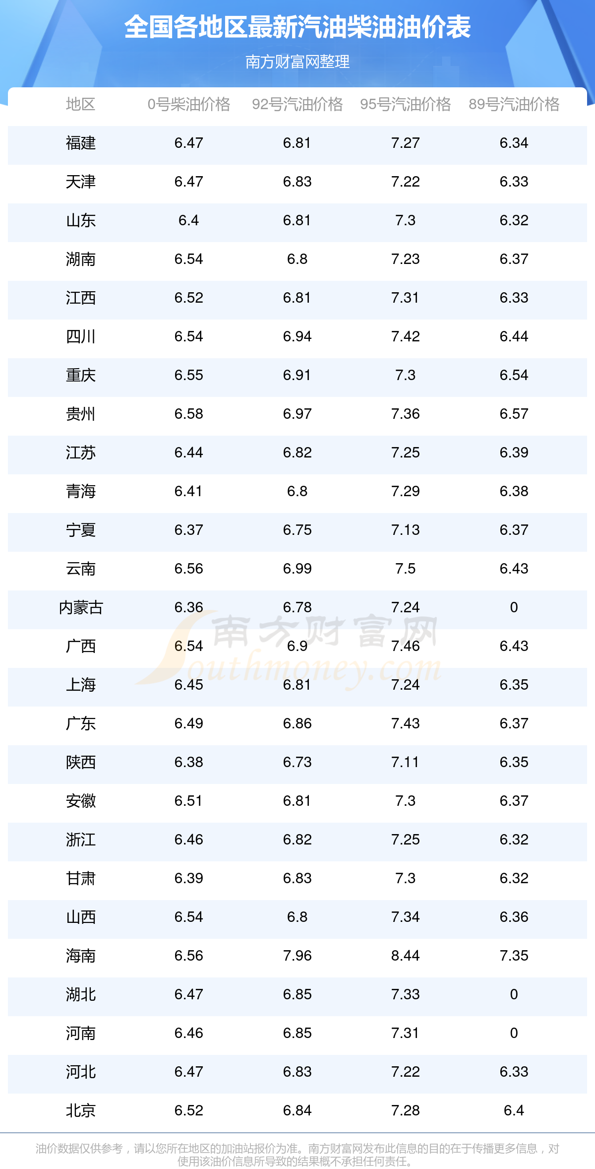 2025年11月6日全國各地汽油價(jià)格調(diào)整時(shí)間及價(jià)格一覽表