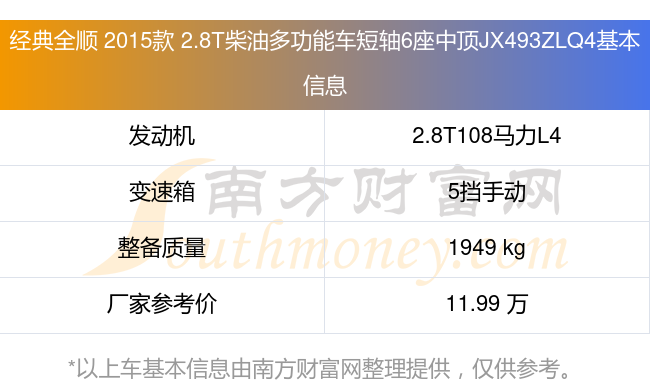 經(jīng)典全順 2015款 2.8T柴油多功能車短軸6座中頂JX493ZLQ4動力上配備的是一臺2.8T108馬力L4渦輪增壓發(fā)動機,匹配的是5擋手動擋變速箱,燃料形式為柴油,常規(guī)整備質(zhì)量1949kg,廠家參考價11.99萬元。