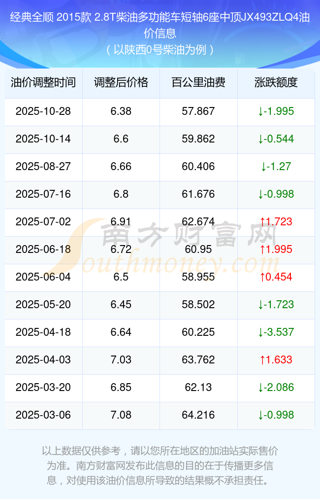 根據(jù)10月28日0號柴油最新調(diào)整價格6.38元/升來計算(以陜西為例),該車型每百公里的平均油費是57.867元,上一輪10月14日調(diào)整價格6.6元每升來計算,每百公里的平均油費是59.862元,對比上一輪少花1.995元,下一輪的油價調(diào)整時間是11月10日24時。
