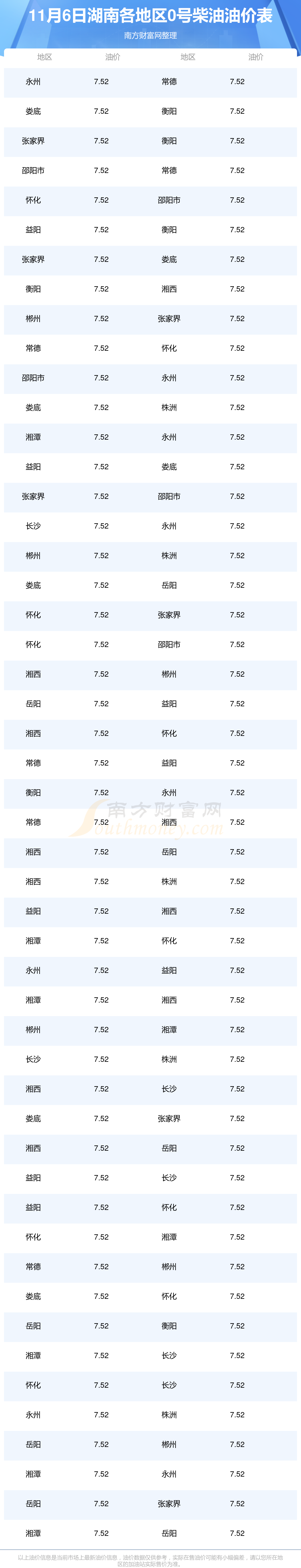 2025年11月6日湖南0號(hào)柴油最新價(jià)格一覽表