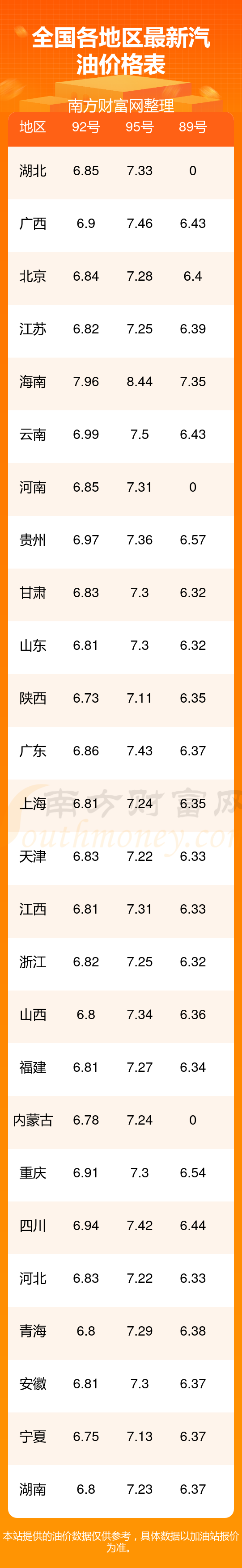 油價數(shù)據(jù)僅供參考,請以您所在地區(qū)的加油站報價為準。南方財富網(wǎng)發(fā)布此信息的目的在于傳播更多信息,對使用該油價信息所導致的結(jié)果概不承擔任何責任。