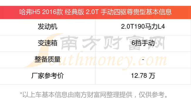 哈弗H5 2016款 經(jīng)典版 2.0T 手動四驅(qū)尊貴型動力方面,搭載的是一臺2.0T190馬力L4渦輪增壓發(fā)動機,匹配6擋手動擋變速箱,燃料形式為汽油,廠家參考價12.78萬元。