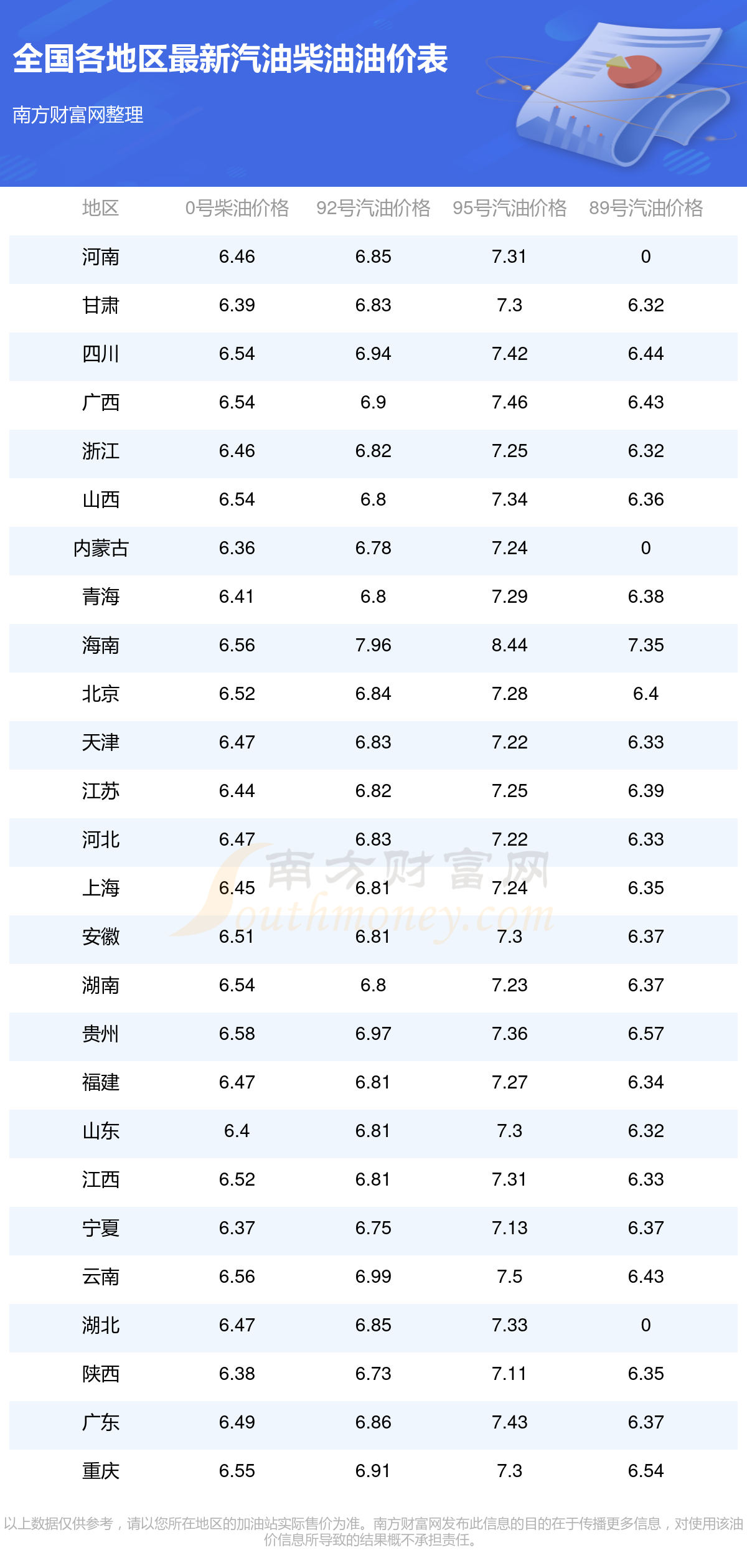 以上數(shù)據(jù)僅供參考,請以您所在地區(qū)的加油站實際售價為準(zhǔn)。南方財富網(wǎng)發(fā)布此信息的目的在于傳播更多信息,對使用該油價信息所導(dǎo)致的結(jié)果概不承擔(dān)責(zé)任。